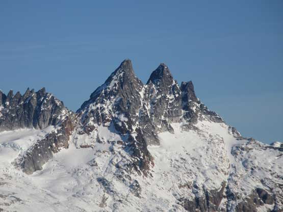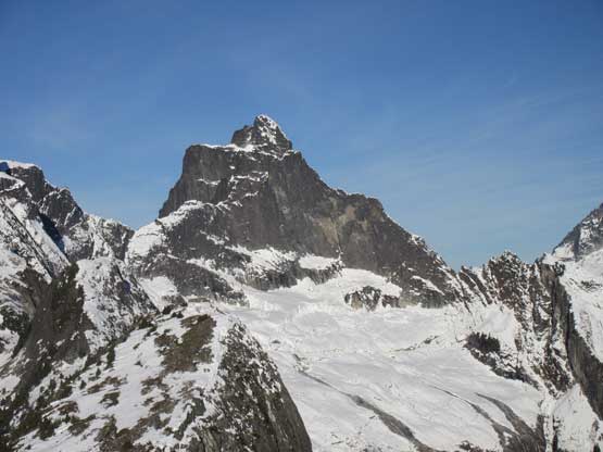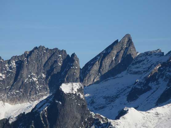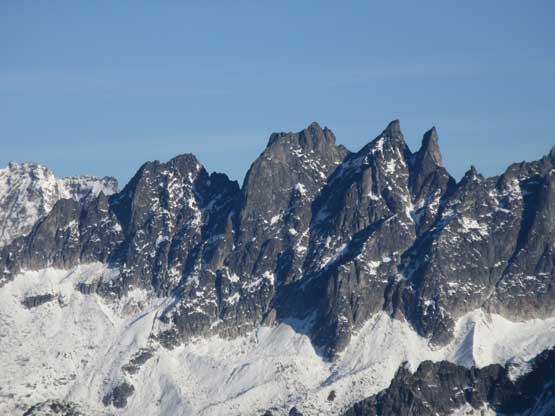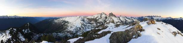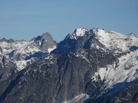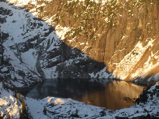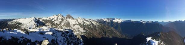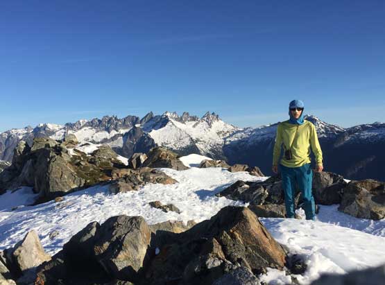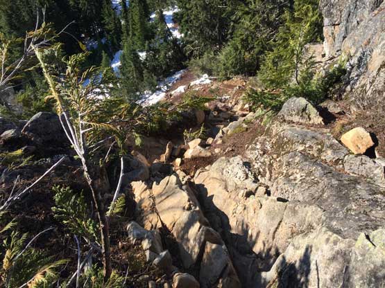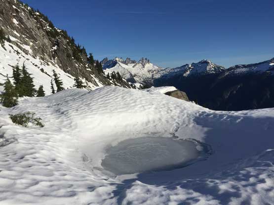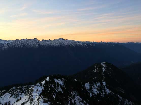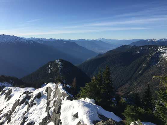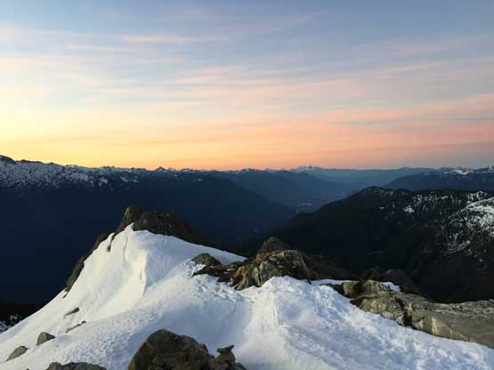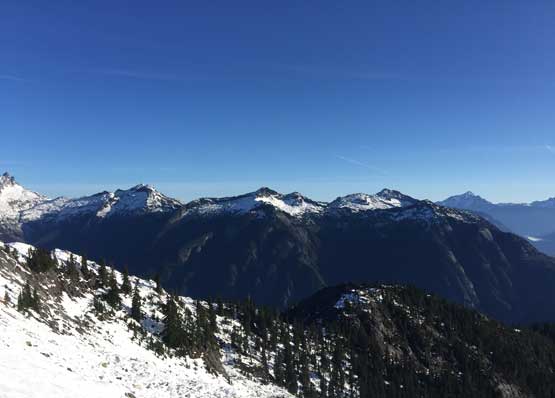 The first portion of Thornton Lake trail was rather just the extension of the logging roads except that this portion of the roads was deactivated and long gone. I had to hop across at least two creeks on slippery, iced-up rocks and thankfully the main Thornton Creek crossing was bridged. The actual trail was well marked, not too steep and easy to navigate. I made some slow, but steady progress on the endless switchbacks and didn’t encounter snow until 1300 m elevation. The snow was icy and compact but no traction needed, and I made to the junction where Trappers Peak’s south ridge route branched off from the main Thornton Lake trail in just trail-runners. It appeared that hikers had gone towards Trappers Peak in this past week judging by the foot prints but the tracks did involve fair amount of post-holes so I took the first, and the only long break swapping footwear for mountaineering boots and gaitors. The hike onto the south ridge of Trappers Peak became steep in one spot that I probably would classify as “class 3-” and was pretty easy.