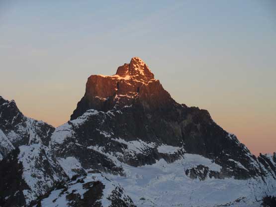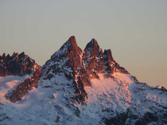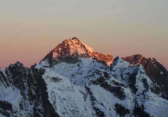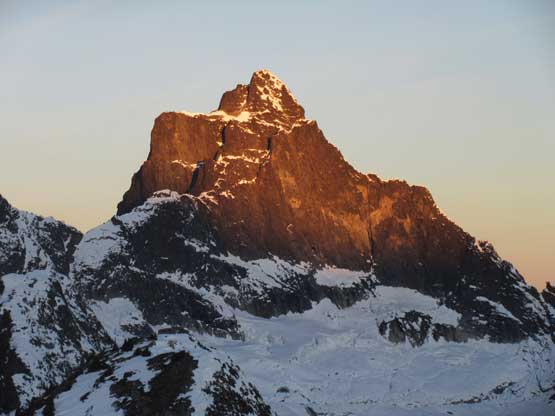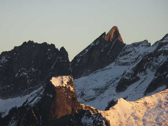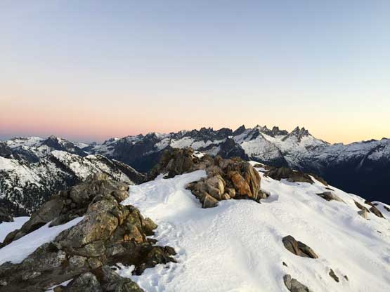After gaining the proper south ridge the sky had brightened up enough that I no longer needed my headlamp. I followed the previous footsteps over a dip and then some steep, but easy ground. There’s one narrow spot with mild exposure but nothing particularly worth noting, until the summit block. The ascent was done on the east side of the block on steep snow. The snow was icy but utilizing the holes made by previous parties I didn’t have to use neither ice axe nor crampons. I arrived at the summit at least half an hour before sunrise. I wasn’t sure how long the traverse to “X” would take, so decided to wait patiently on the summit of Trappers Peak for sunrise to come, in wind and frigid temperatures. My figures were literally frozen while taking photos but the views were definitely worth the cold fest.