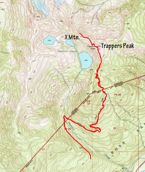 The hike to and back from “X Mountain” had taken me longer than expected, that by the time I was back on the summit of Trappers Peak I reliazed that I probably should start picking up some speeds on the descent. I still didn’t bother with any traction device descending the steep slopes below the summit and the easily followed the tracks back across that narrow spot on the south ridge. The rest of the descent was rather boring and tedious. I somehow managed to miss the spot where I ditched the shoes and had to backtrack a little bit to retrieve them. The last few kilometers on the abandoned logging road was done by a mix of walking and jogging. My round trip time was under 7 hours and that included some long waiting around on the summit.