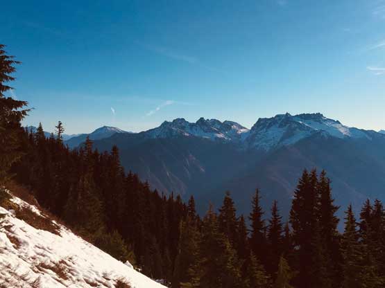 The first portion of Thornton Lake trail was rather just the extension of the logging roads except that this portion of the roads was deactivated and long gone. I had to hop across at least two creeks on slippery, iced-up rocks and thankfully the main Thornton Creek crossing was bridged. The actual trail was well marked, not too steep and easy to navigate. I made some slow, but steady progress on the endless switchbacks and didn’t encounter snow until 1300 m elevation. The snow was icy and compact but no traction needed, and I made to the junction where Trappers Peak’s south ridge route branched off from the main Thornton Lake trail in just trail-runners. It appeared that hikers had gone towards Trappers Peak in this past week judging by the foot prints but the tracks did involve fair amount of post-holes so I took the first, and the only long break swapping footwear for mountaineering boots and gaitors. The hike onto the south ridge of Trappers Peak became steep in one spot that I probably would classify as “class 3-” and was pretty easy.
