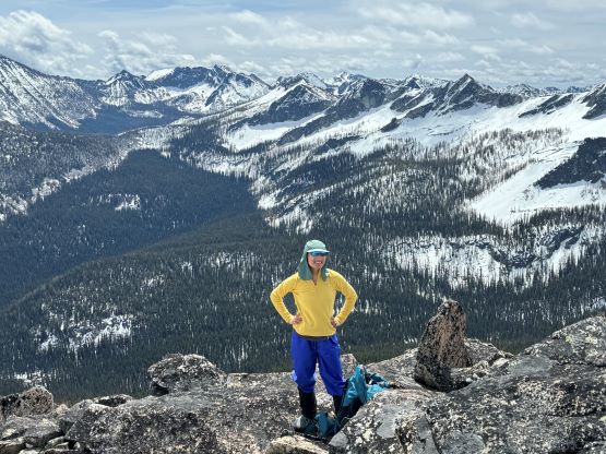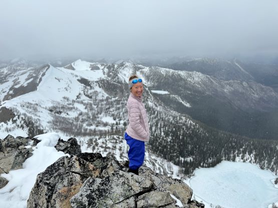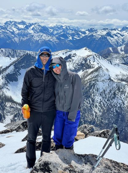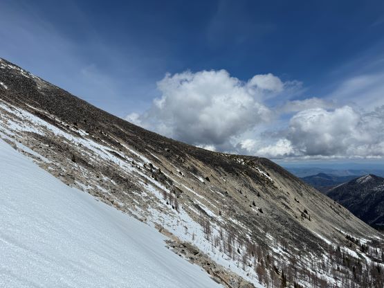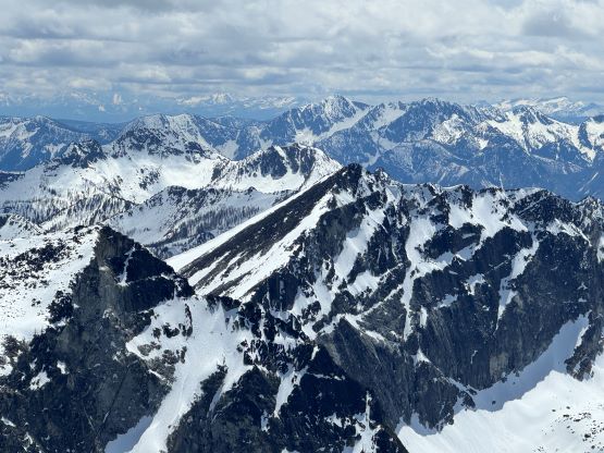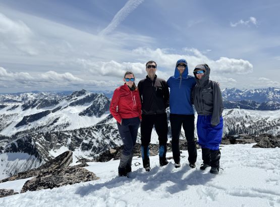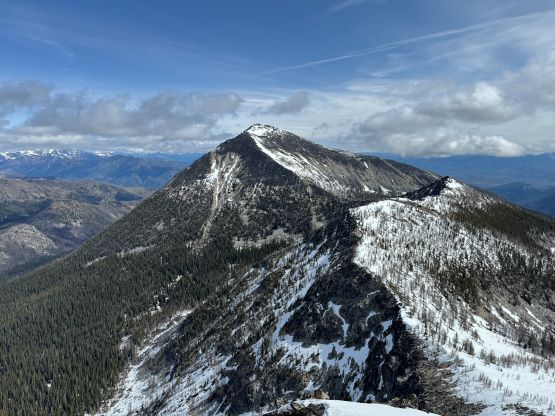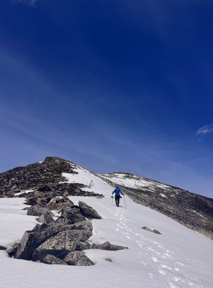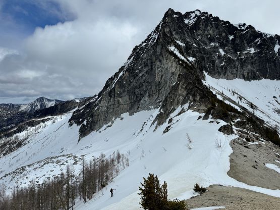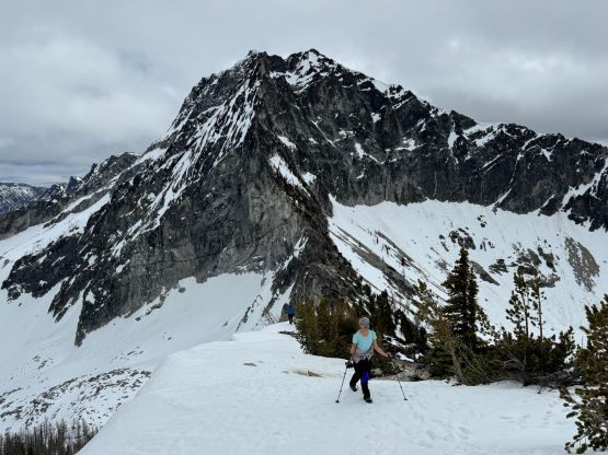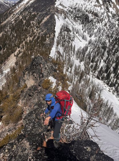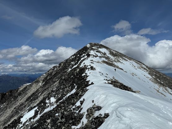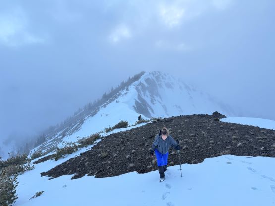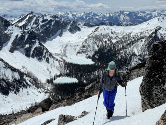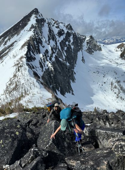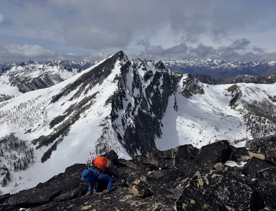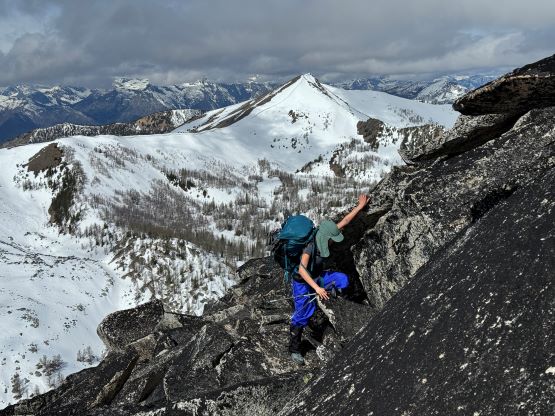 Indeed, I was able to lead us down the NE Face of Buttermilk Ridge by mostly staying on snow, and then traversed around one subsidiary bump and only did one short scrambling section to the summit of “Buttermilk Ridge North”. This peak does not have 100 m prominence nor a name so I’m not logging it in. The technical crux was followed shortly after as we descended the difficult ridge down to Buttermilk/Oval saddle. I knew there are several ways to bypass this section but all of those options involved more elevation loss and regain. I wanted to make this trip a bit more challenging than just a “plod” so down the ridge we went. The terrain turned out to be a mixture of 3rd class scramble and steep snow and it was decently exposed, and I thought it was an oppourtunity for Erica to practice scrambling, especially with a monstrous backpack. It was definitely strenuous but she handled excellently. Once everyone made down to the saddle we ditched our backpacks and slogged that 350 tiring vertical meters to Oval Peak. We saw the previous party descending from the summit and we were able to follow their tracks up and stayed mostly on snow to speed things up. Due to the improving weather we did a fairly long summit stay on the highest peak of the Wish Slam.