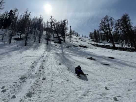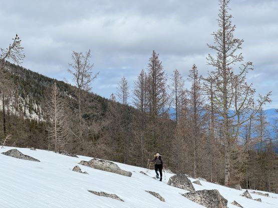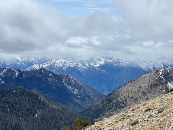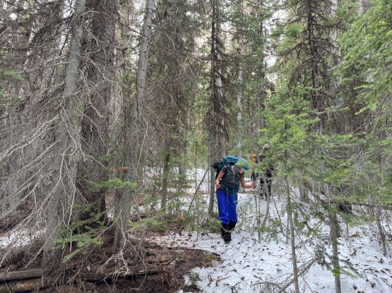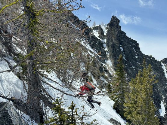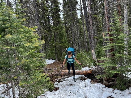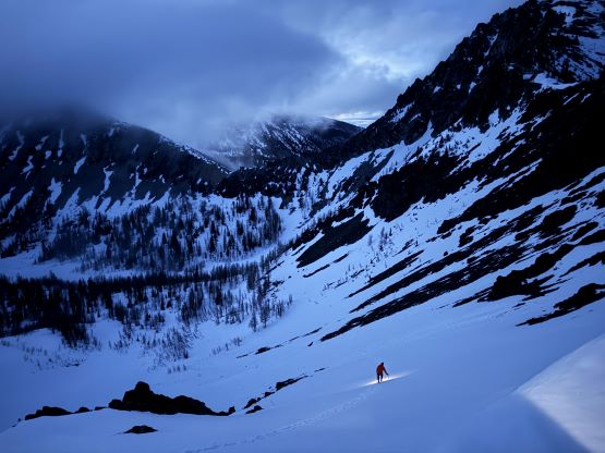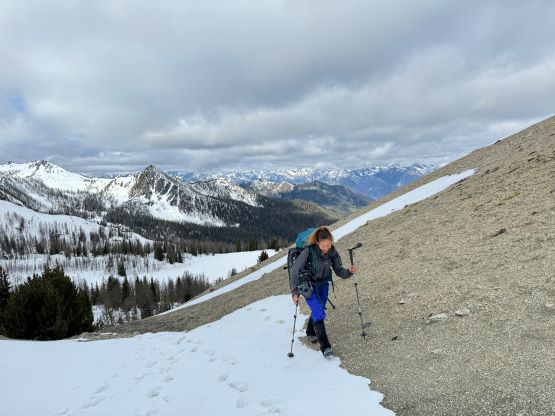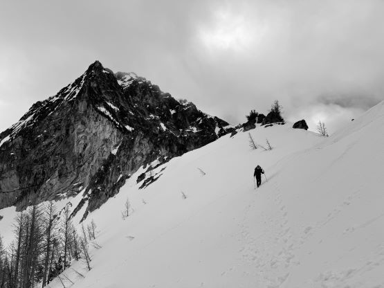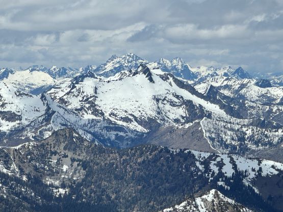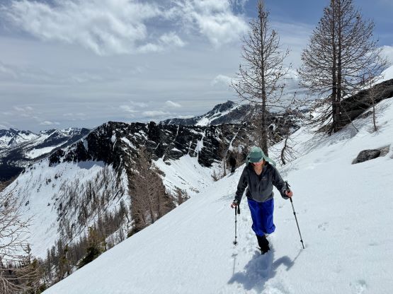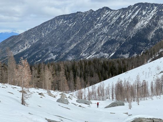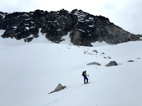We eventually started the approach at 8:45 am under some overcast skies. The log crossing to the north side of West Buttermilk Creek was intact but the trail itself seemed rather unofficial. There was no indication that we were supposed to cross to the other side of the creek but we all did our homework and also came prepared with multiple sets of GPX tracks to follow. The next 5 km was rather uneventful but after crossing a gigantic mudslide path we encountered some annoying dead-falls. The situation was nowhere as bad as some groups made it sound like, but it was definitely annoying with the heavy packs. Shortly before reaching the Oval Peak’s bushwhacking short-cut I swapped trail-runners for mountaineering boots as we started to encounter larger patches of snow, and despite the previous tracks the snow was not very supportive. Everyone else opted to wear one pair of footwear (hiking boots) throughout the trip but I liked the comfort of the runners on the approach, and I also liked the stiffness of my mountaineering boots on the snow. I also decided to take the 105L backpack so the fitting of all those gears and boots was not a problem. We donned snowshoes at around 1800 m and we did need them for this trip. To ascend to Fish Creek Pass I decided to do our own route-finding by aiming at the large opening under Star Peak’s north face, rather than following the “trail” and the existing GPX tracks. I think this route worked out well because that open area (supposedly to be some boulder fields) was entirely covered in snow and the travel was very straightforward on snowshoes.