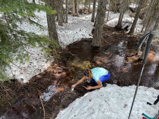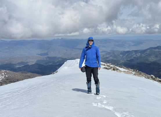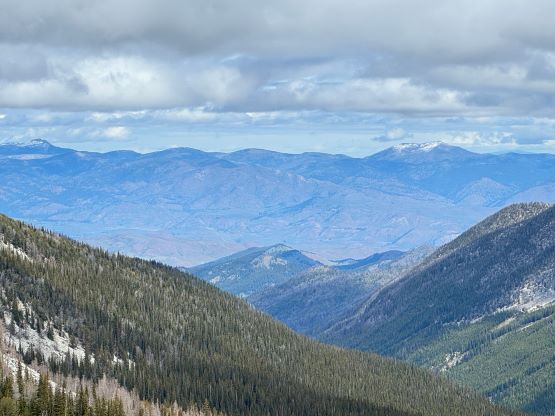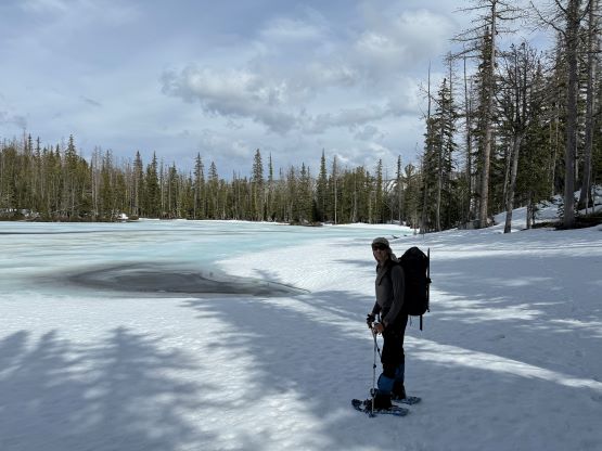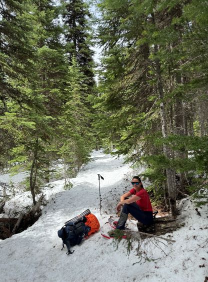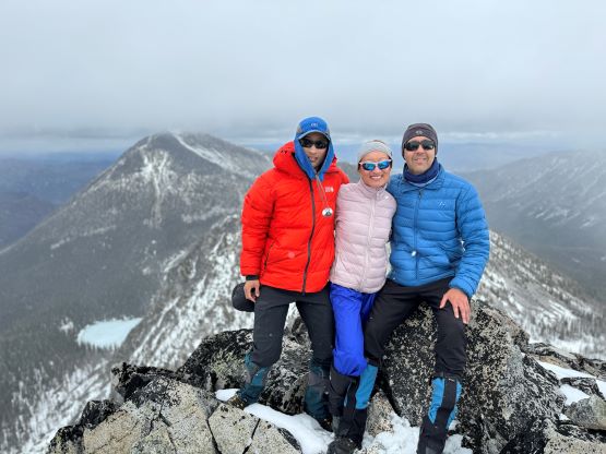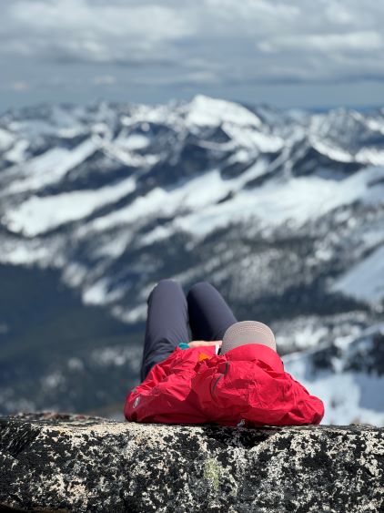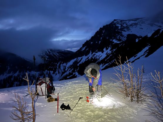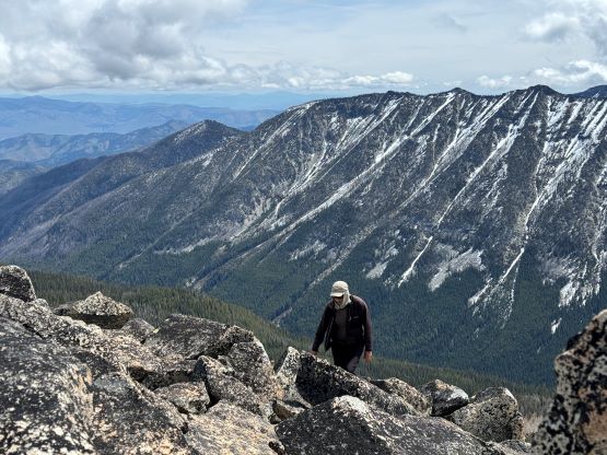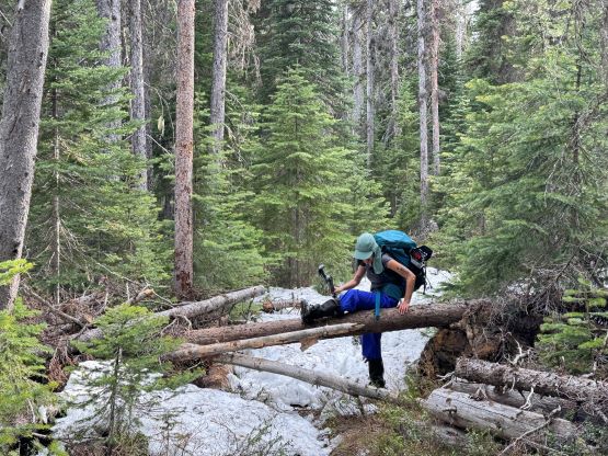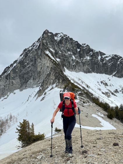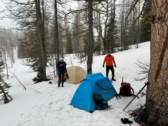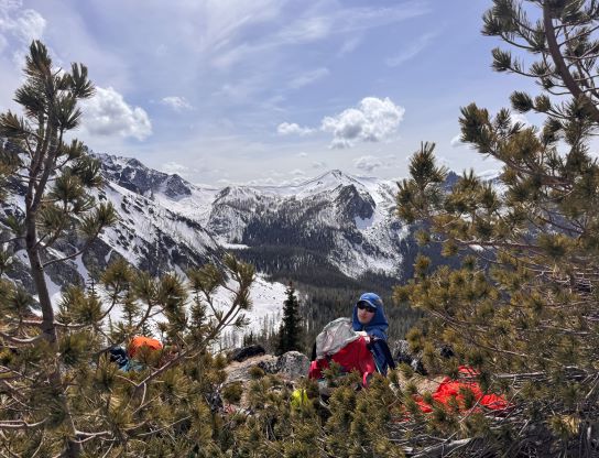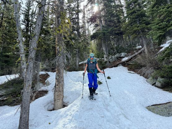 We were able to keep the snowshoes on all the way to Fish Creek Pass but ditched them in addition to the gigantic backpacks immediately upon arrival. The plan was to ascend Courtney Peak in the light-and-fast style and the few of us carried absolutely nothing. The SW Ridge of Courtney Peak was as straightforward as it appeared on the maps, and because of the snow coverage we were also able to choose either snow or rock. Holly decided to tuck in her emergency bivy while waiting for us because the weather was not very promising, and Erica, Vlad and I did ascend into a snow squall eventually. I led us staying mostly on the snow until the very top where we briefly did some scrambling on slick boulders, and the summit stay was short thank to the incoming weather. The idea of grabbing Gray Peak while we were already there also faded away and that was a good thing, because the weather was only becoming worse. After quickly making our way down the SW Ridge we shouldered the heavy packs and hand-carried the snowshoes down to the still-frozen Star Lake to set up our camp. It snowed and rained continuously for the next few hours so we spent most of the time resting in the sleeping bags. The weather forecast was not calling for “bluebird” conditions but none of the models showed that much of continuous precipitation.