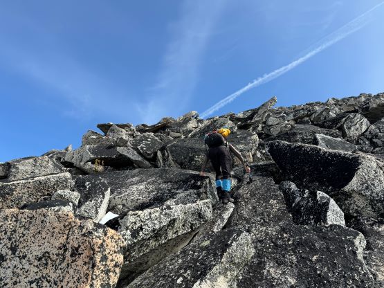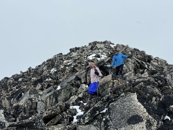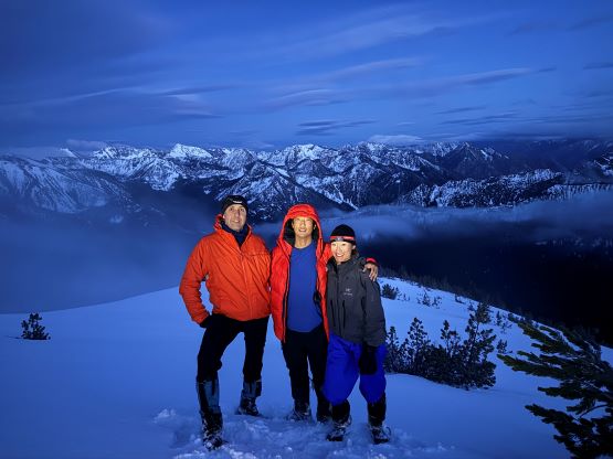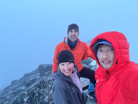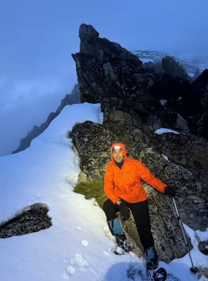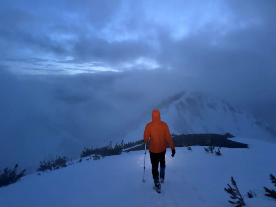Vlad led us descending a slightly different route to avoid the worst of those slick boulders, and by the time we rejoined our tracks on the snow we had to turn on the head-lamps. Holly was only partially correct, as the weather finally improved (could be nicer if it happened an hour earlier) so the three of us spent some time on the ridge to soak in the views. Both Erica and I had the iPhone 15 Pros so the photo quality was actually excellent in the fading daylight. After taking in enough of the views we rushed back to the camp and settled for the night. I had to wear the winter park while using both the -7C and the +2C sleeping bags, and it definitely felt like a proper “winter camping” trip.