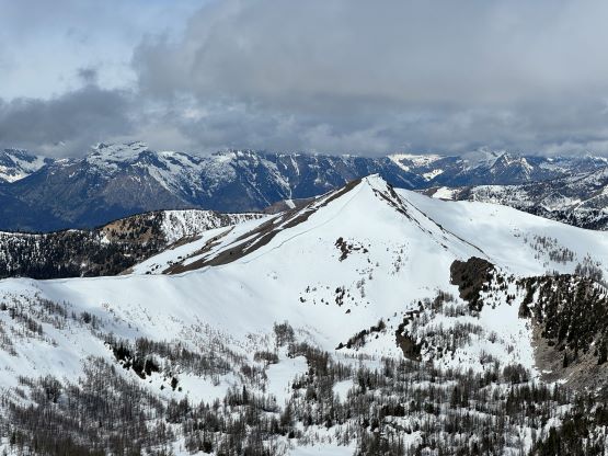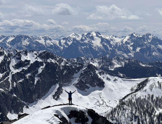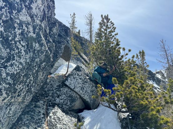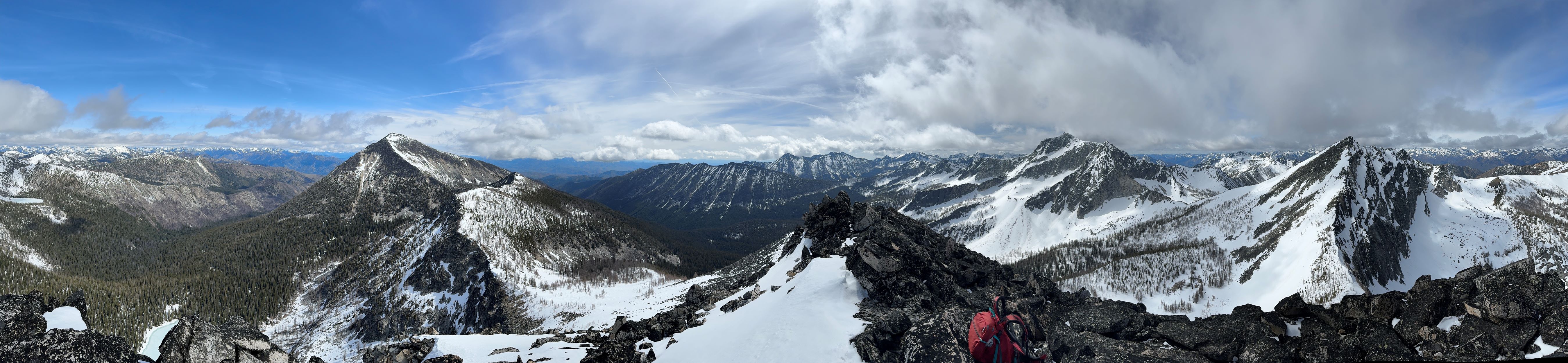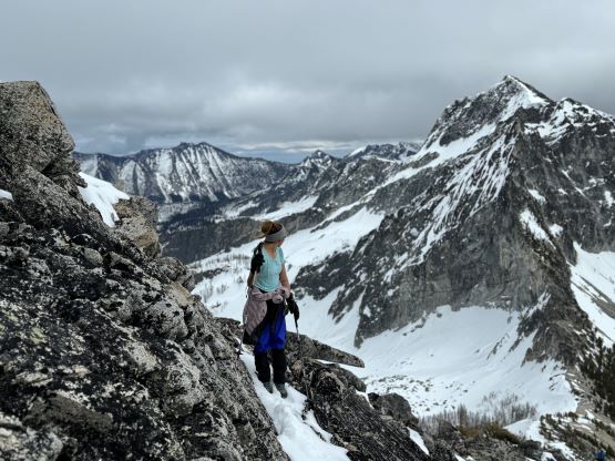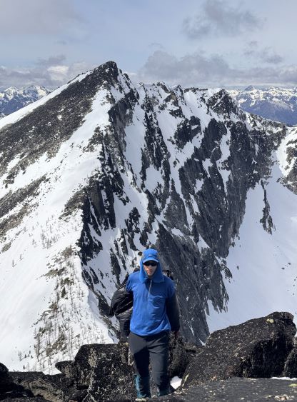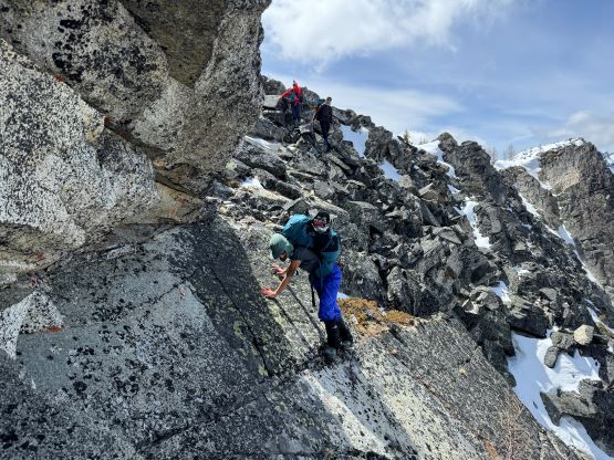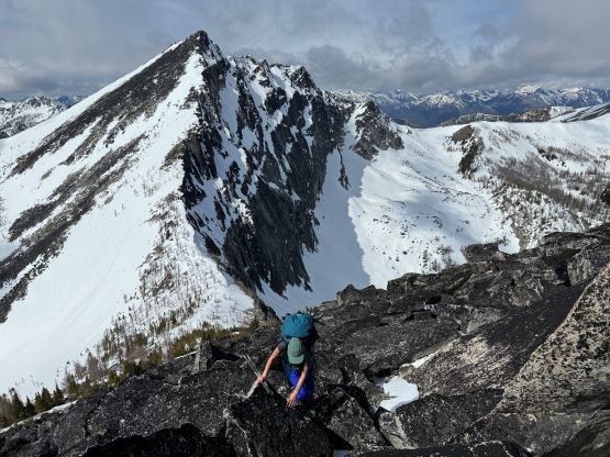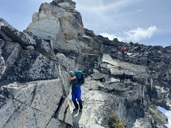 Indeed, I was able to lead us down the NE Face of Buttermilk Ridge by mostly staying on snow, and then traversed around one subsidiary bump and only did one short scrambling section to the summit of “Buttermilk Ridge North”. This peak does not have 100 m prominence nor a name so I’m not logging it in. The technical crux was followed shortly after as we descended the difficult ridge down to Buttermilk/Oval saddle. I knew there are several ways to bypass this section but all of those options involved more elevation loss and regain. I wanted to make this trip a bit more challenging than just a “plod” so down the ridge we went. The terrain turned out to be a mixture of 3rd class scramble and steep snow and it was decently exposed, and I thought it was an oppourtunity for Erica to practice scrambling, especially with a monstrous backpack. It was definitely strenuous but she handled excellently. Once everyone made down to the saddle we ditched our backpacks and slogged that 350 tiring vertical meters to Oval Peak. We saw the previous party descending from the summit and we were able to follow their tracks up and stayed mostly on snow to speed things up. Due to the improving weather we did a fairly long summit stay on the highest peak of the Wish Slam.