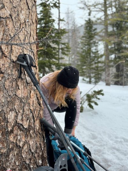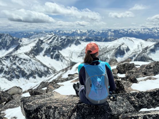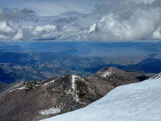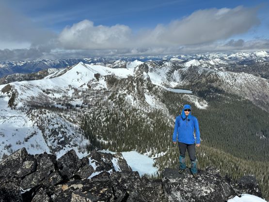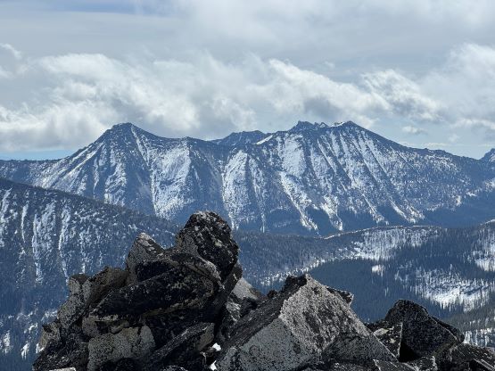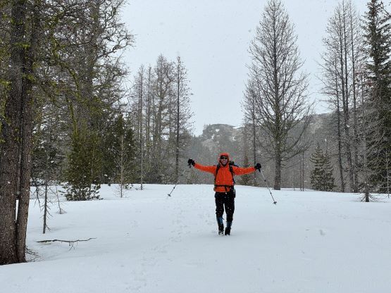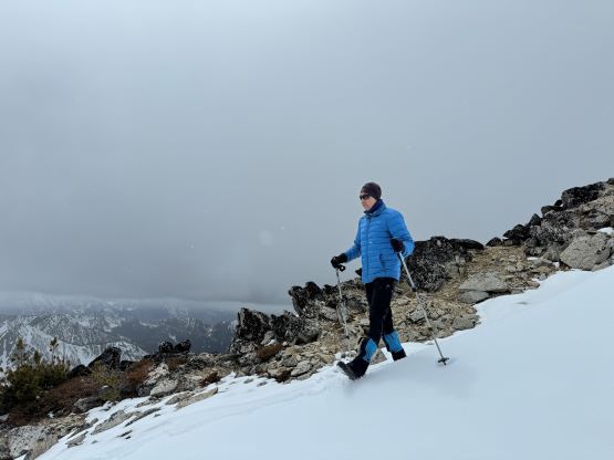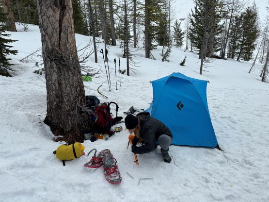 We were able to keep the snowshoes on all the way to Fish Creek Pass but ditched them in addition to the gigantic backpacks immediately upon arrival. The plan was to ascend Courtney Peak in the light-and-fast style and the few of us carried absolutely nothing. The SW Ridge of Courtney Peak was as straightforward as it appeared on the maps, and because of the snow coverage we were also able to choose either snow or rock. Holly decided to tuck in her emergency bivy while waiting for us because the weather was not very promising, and Erica, Vlad and I did ascend into a snow squall eventually. I led us staying mostly on the snow until the very top where we briefly did some scrambling on slick boulders, and the summit stay was short thank to the incoming weather. The idea of grabbing Gray Peak while we were already there also faded away and that was a good thing, because the weather was only becoming worse. After quickly making our way down the SW Ridge we shouldered the heavy packs and hand-carried the snowshoes down to the still-frozen Star Lake to set up our camp. It snowed and rained continuously for the next few hours so we spent most of the time resting in the sleeping bags. The weather forecast was not calling for “bluebird” conditions but none of the models showed that much of continuous precipitation.