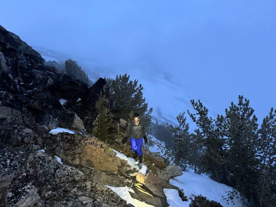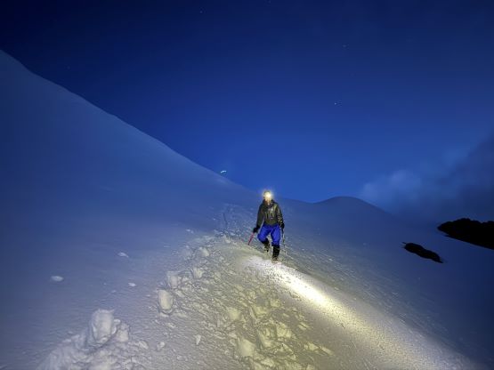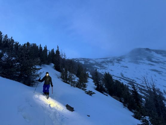 Vlad led us descending a slightly different route to avoid the worst of those slick boulders, and by the time we rejoined our tracks on the snow we had to turn on the head-lamps. Holly was only partially correct, as the weather finally improved (could be nicer if it happened an hour earlier) so the three of us spent some time on the ridge to soak in the views. Both Erica and I had the iPhone 15 Pros so the photo quality was actually excellent in the fading daylight. After taking in enough of the views we rushed back to the camp and settled for the night. I had to wear the winter park while using both the -7C and the +2C sleeping bags, and it definitely felt like a proper “winter camping” trip.