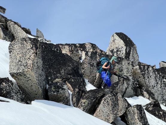 In the morning I could see clouds coming in and out and Star Peak was still mostly soaked in, so we took our time and did the morning routine rather lazily. We eventually shouldered the heavy packs and the slog back up to Fish Creek Pass felt definitely like a drag. The weather was fortunately improving, so we stuck to the original plan to traverse the ridgeline between Buttermilk Ridge and Oval Peak. There are other ways to get to Oval Peak by skipping that bonus T200 peak but none of those options was “straightforward”. We might as well pick one so that we could bag an extra peak. We donned crampons for that steep side-hill traverse from Fish Creek Pass to Courtney/Buttermilk saddle and then embraced the steep scramble up the SW Face of Buttlemilk Ridge. The terrain was mostly boulders and the boulders were quite gigantic. Sometimes we had to pull some 3rd class moves and the scrambling was quite tiring and difficult with the heavy packs. Vlad, Erica and I made the summit but I had to come back halfway down the face to carry Holly’s pack up. This section was the physical crux of the trip and turning around wasn’t an option as we were not doing that out-and-back thing. Thankfully the ridge traverse towards “Buttermilk North” was mostly on snow.