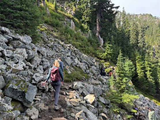 I noticed a “climber’s trail” that connects Chair Peak’s scramble route to the divide/pass above Snow Lake and by taking this trail we could save 150 m elevation loss and regain. I wasn’t quite sure about the quality of this trail as my only “beta” was the dotted lines on the Gaia map. This trail turned out to be rather excellent that we even managed to run most of it. We were joined by the hordes of hikers at the pass and for the next kilometer dropping down to Snow Lake we passed at least 50 people if not 100, mostly on their way back but some were still walking in. The area around the lake had some confusing trails and I accidently led us taking a side branch descending towards the lake. Thankfully I quickly noticed the mistake and got us back on track. The ascent of Wright Mtn. was rather no-brainer but dragged on for much longer than I was originally hoping for. There were some seemingly unnecessary switchbacks that made the distance longer than what appeared on the map. We had to take one energy break about 150 vertical meters under the summit, above Gem Lake. The final push to the very top involved some brief boulder hopping but the path was generally easy to follow. I knew I would definitely be late for work even if I could stay awake for the entire drive back home, but I would save the worries for later. The view of the pointy peaks to the west was indeed impressive from this little peaklet so we did not regret making this extension, even though Snow Lake itself was rather mediocre.
