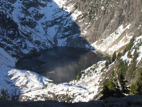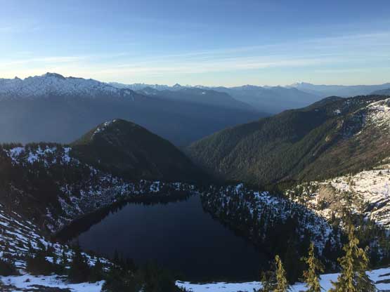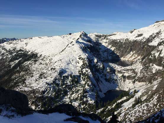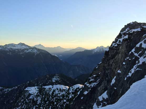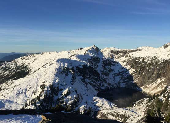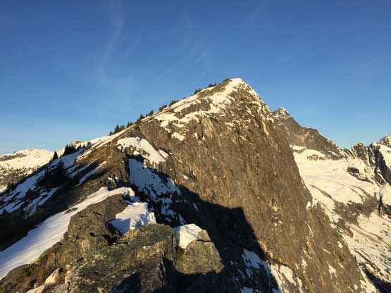 Earlier in the morning I had watched sunrise from the summit of Trappers Peak and now I turned my focus onto the next objective. The previous hikers’ tracks all stopped at the summit of Trappers Peak so I was on my own, exploring a route down the NW ridge. The snow was firm and icy but not steep enough to require traction devices. There’s a section of steep and semi-exposed heather slope to descend. The grass was free of snow, but frozen solid that I had to be extra cautious. By comparison, the SE Ridge of X Mountain was rather just a scenic ridge walk.