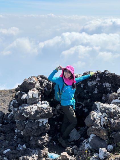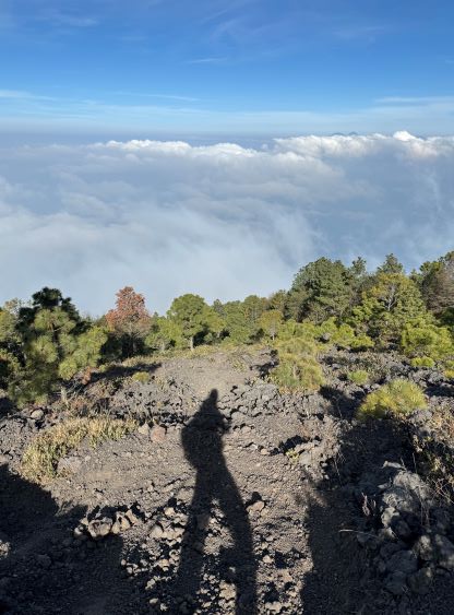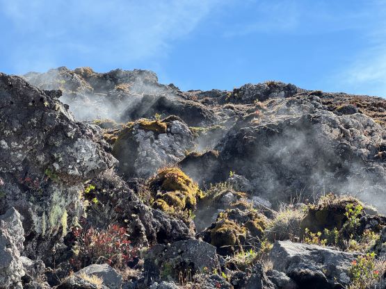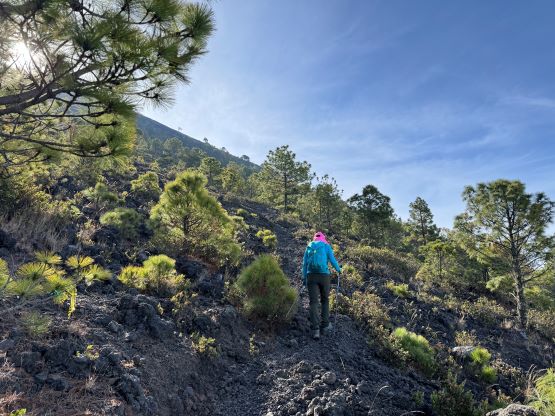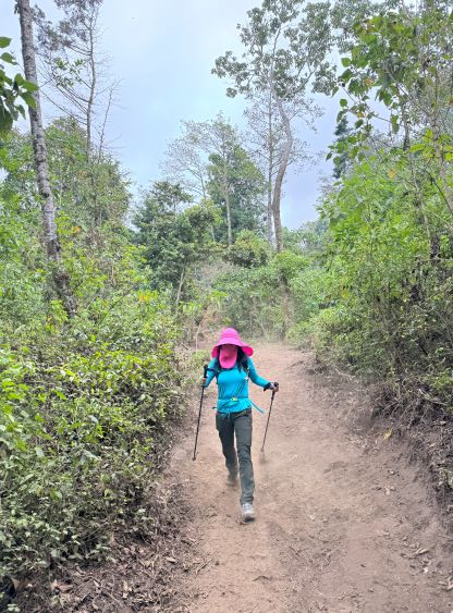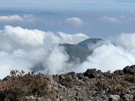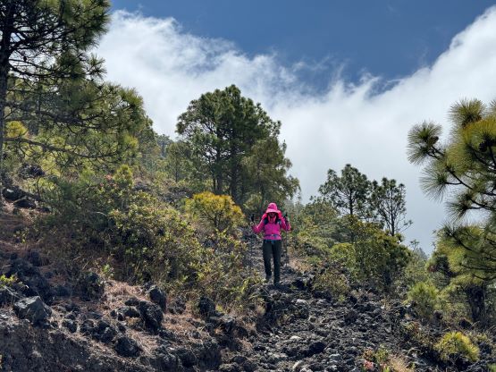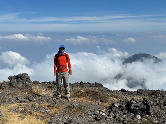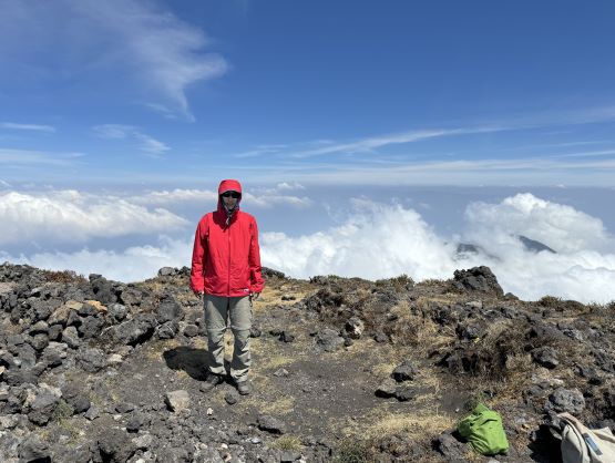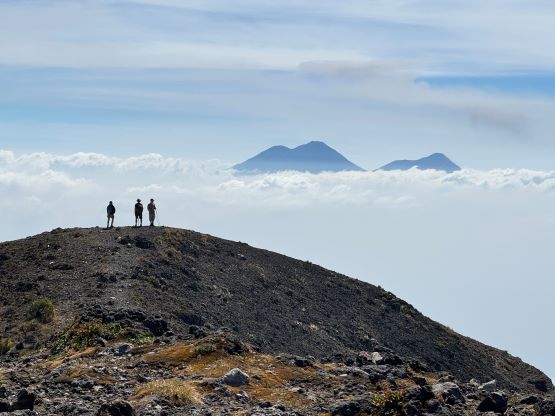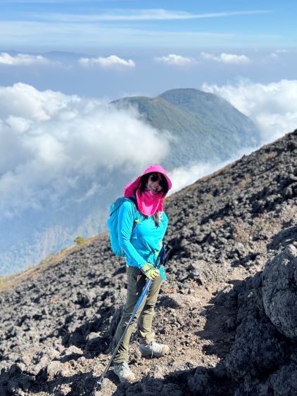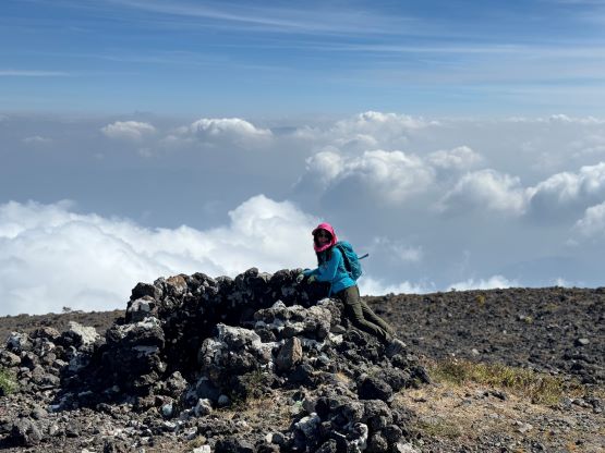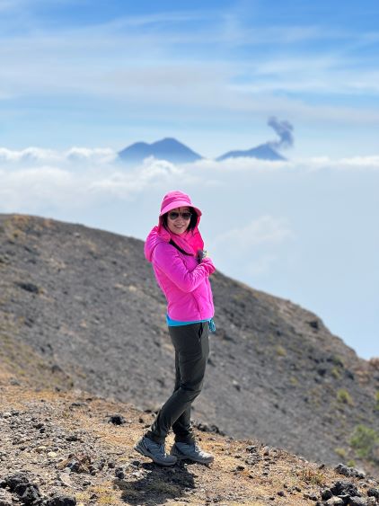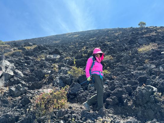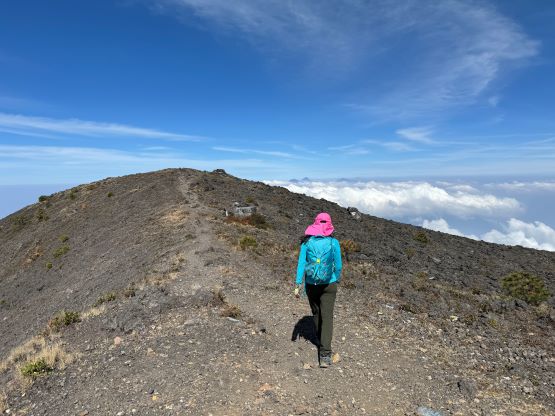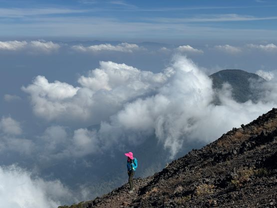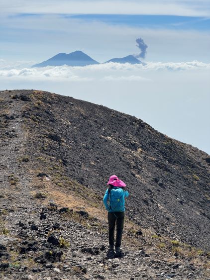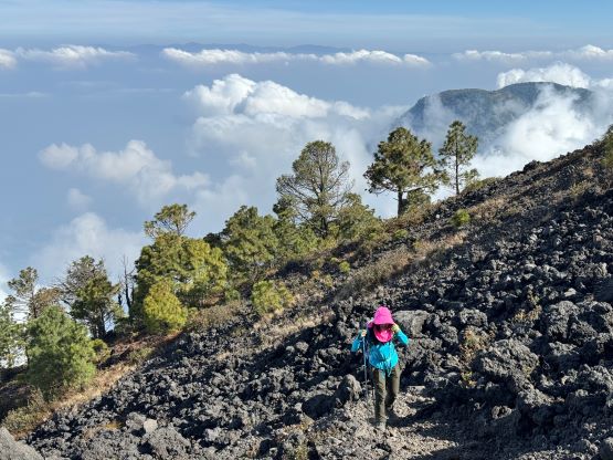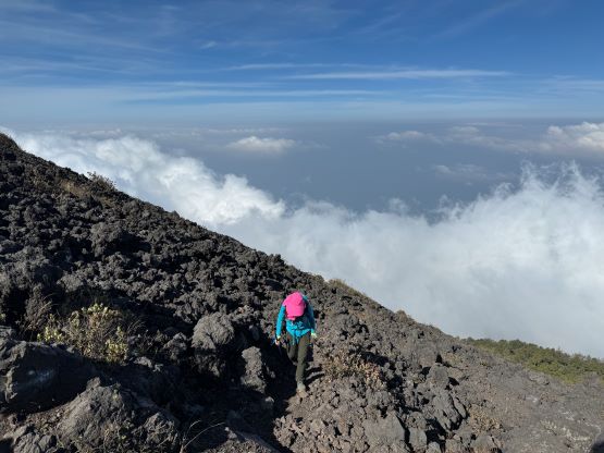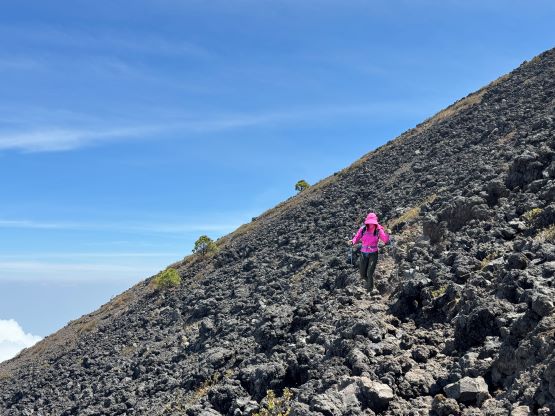 I thought the 5 am departure was essential given the 1700 m elevation gain, but in retrospect we could have started at the usual 6 am. The first half an hour had to be done with head-lamps on. The lower portion of this trail ascends through some farm lands and loggers had also been using this trail (or more precisely, the trail system) to collect woods. I was not anticipating so many junctions and as a result we made a pretty significant navigation error. Thankfully I did have the habit to check the GPS screen for every 5-10 minutes so it didn’t cost us too much. It was then a long and boring grunt at a fairly consistent mellow grade until we caught up to the group of Canadian hikers. It took us no more than a minute to realize that we both actually spoke English. This group of three hiked rather fast, but needed to take breaks frequently, such that Kate and I were still faster overall. Kate in fact, did not need a single stop for the entire 1700 m ascent to the summit. I did take one break at the treeline while waiting for Kate to catch up, but I also needed that break to don sun protections. The uppermost 400 m was on some volcanic choss, but the path had been nicely laid with endless switchbacks, such that we felt like walking on a proper trail for the entire time. After passing several fumaroles we ascended onto the crater rim and easily traversed to the true summit, as well as the eastern sub-summit that offered better views towards Acatenango/Fuego volcanoes. Kate’s ascent time was 4 hours 12 minutes so I told her that she was exactly 1 hour behind Craig Barlow’s time.